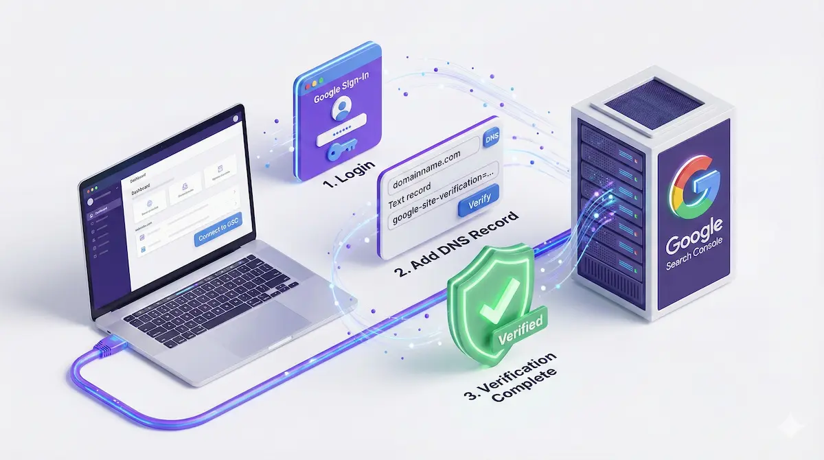 خلاصه مراحل: ۱. داشتن جیمیل ۲. ورود به search.google.com ۳. وارد کردن آدرس سایت ۴. کپی کد تایید ۵. قرار دادن کد در سایت (DNS یا HTML) ۶. زدن دکمه Verify.